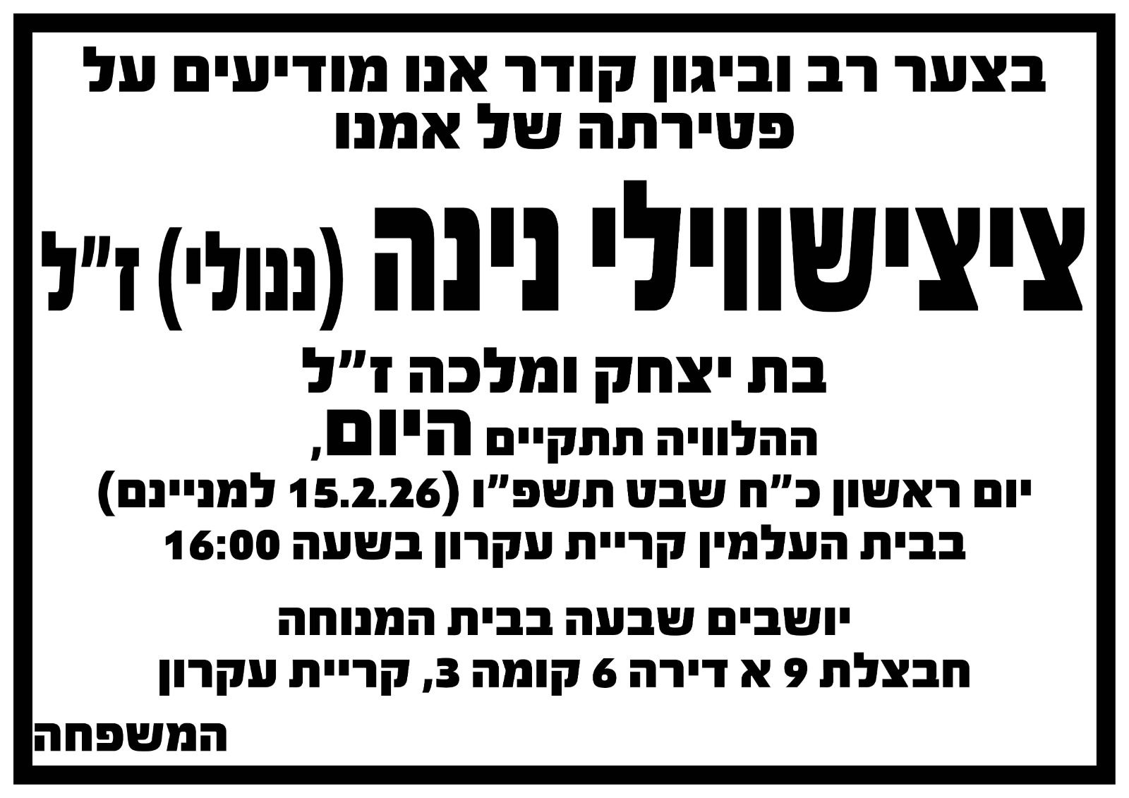 בעצב רב קיבלנו את הבשורה על פטירתה של נינה צ’ישווילי ז״ל. נינה הייתה דמות אהובה ויקרה, והלכתה משאירה חלל גדול בלב של כולנו. בימים קשים אלו אנו שולחים לכם חיבוק גדול, כוח ונחמה.